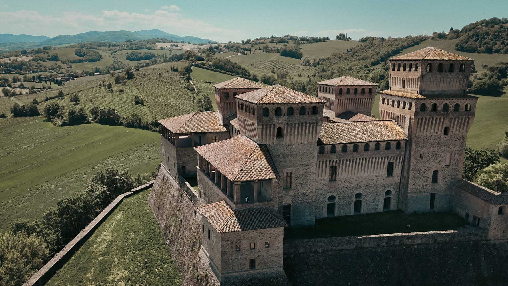 Après quelques heures de pédalage revigorant, notre estomac donne un signe de creux et notre regard est captivé par une silhouette majestueuse se dressant au sommet d’une colline : le château de Torrechiara. Cette forteresse médiévale, avec ses remparts imposants nous attends. C’est l’endroit idéal pour une pause bien méritée et un déjeuner gastronomique locale.